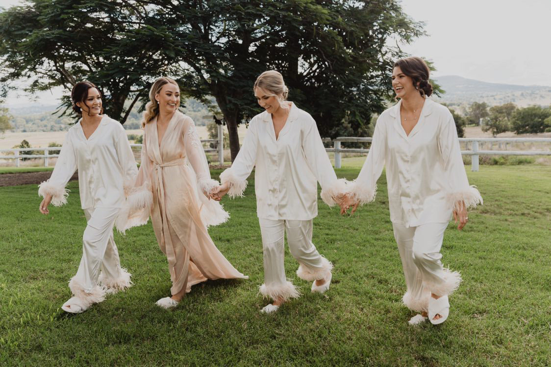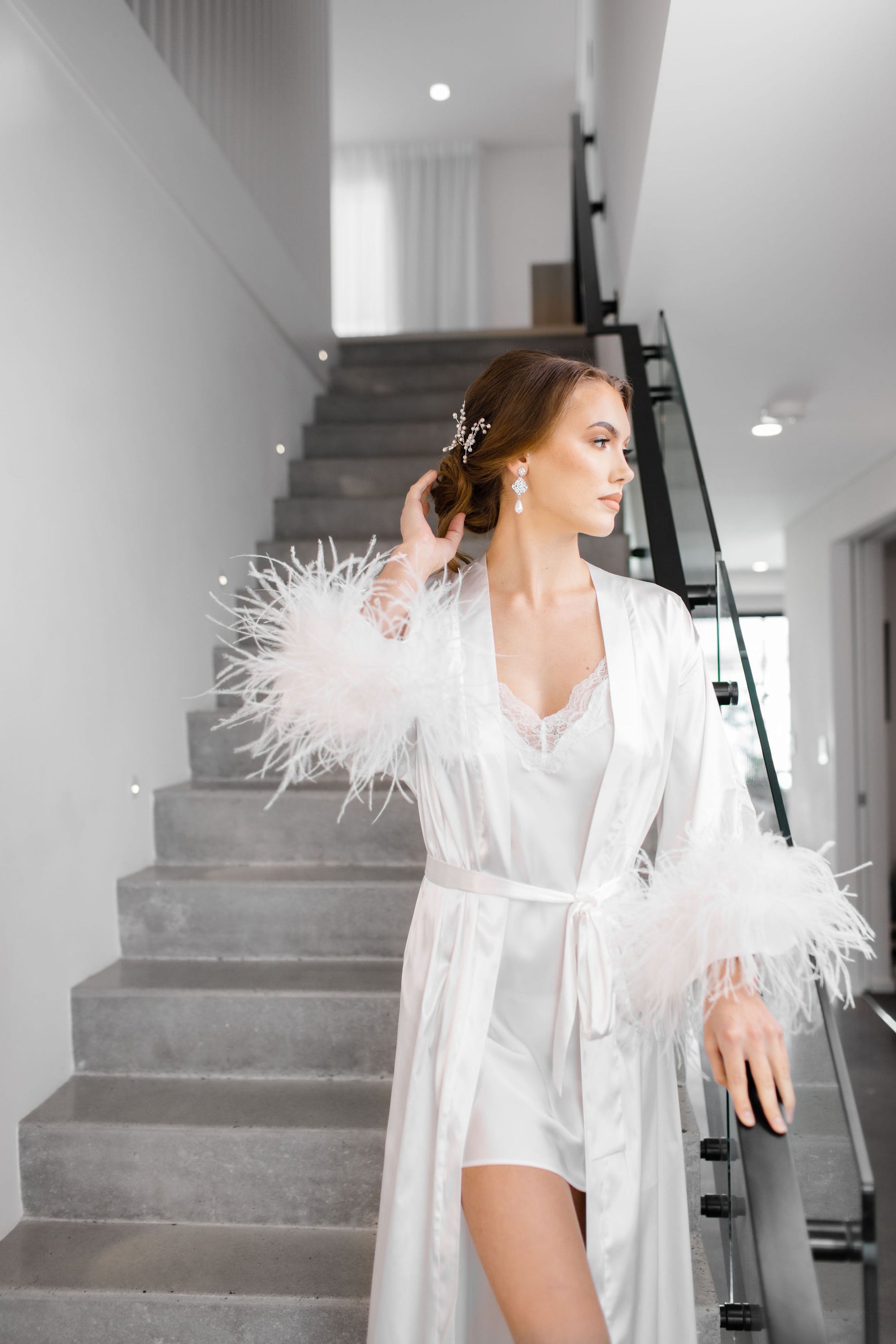 Start your wedding day enveloped in the epitome of elegance and comfort with our exquisite feather-trimmed pyjamas.